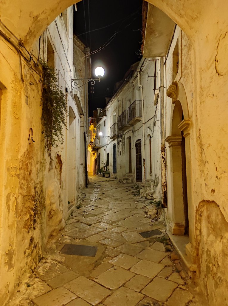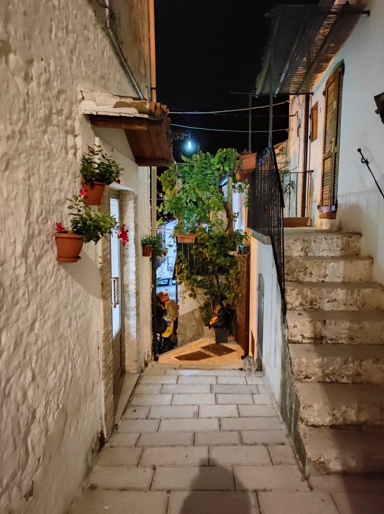 Nella notte, i veri padroni della città oggi sono i gatti, che si allungano ad ogni svolta della strada, dormicchiano sulle mura bianche delle case, fissano curiosi i passanti che risalgono le scale che conducono verso la chiesa di San Giorgio in Terravecchia. Il paese bianco, perso tra le voci delle case e la curiosità dei passanti a vedere dei viaggiatori fuori orario, sembra aver trovato, ancora, dei custodi.