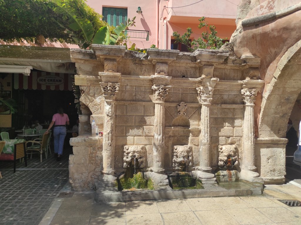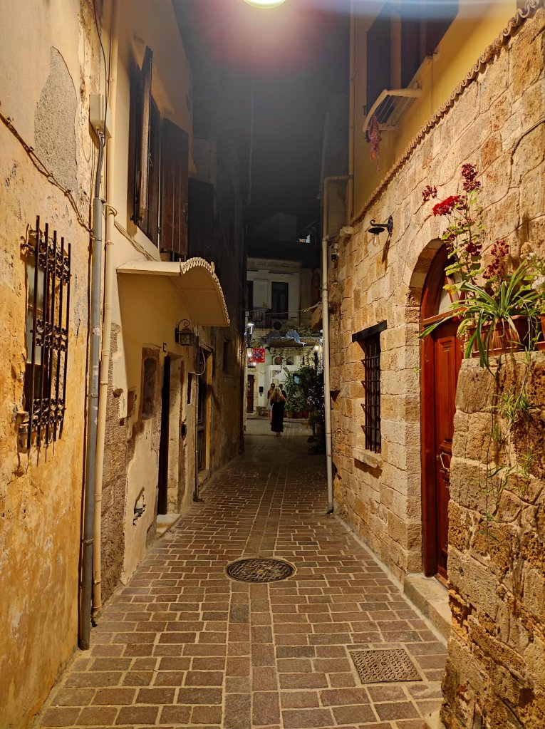 A pranzo mangio yogurt e miele, l’autobus del ritorno è semivuoto e due turisti, avendo evidentemente compreso la natura effimera e relazionale delle fermate, chiedono all’autista di lasciarli nel centro di Rethymno anziché al capolinea. Questi chiede anche la mia approvazione in modo da non dover poi fare strada ulteriore e, quando gliela fornisco, commenta felice “That’s democracy!”, poi apre le porte e mi lascia all’ingresso della città vecchia. Rethymno è fatta di pergolati, di case rosse e bianche, dominata dalla fortezza bizantina e circondata da un mare che nel pomeriggio rovente appare trasparente, con varie persone che ne approfittano per bagnarsi. Il flusso turistico non ha niente da invidiare a Chania e dunque mi trovo a inseguire le strade vuote, che poi sono quelle in cui non vi sono negozi o ristoranti e in cui riesco a soffermarmi sui colori particolari di una porta, sulle strutture in legno di una casa che mi ricordano le abitazioni costruite interamente in legno sul Bosforo di cui parla Pamuk in Istanbul, sulle grandi lanterne che illuminano la notte di questi luoghi. A sera mi riaccoglie Chania, in una taverna ceno con un dakos, una bruschetta cretese condita con pomodoro e feta, e con il boureki, un piatto locale a base di zucchine, patate e formaggio, quindi rimango per un po’ nella piazza di fronte alla Cattedrale dei Tre Martiri, dove musicisti con bouzouki e lira greca suonano e cantano quello che sembra rebetiko. Qualcuno dei locali balla, intravedo un religioso in abito nero che tiene una borsa per consentire a una donna – mi chiedo se sia la moglie – di ballare. Torno in albergo verso mezzanotte. Il giorno successivo mi attende Cnosso.