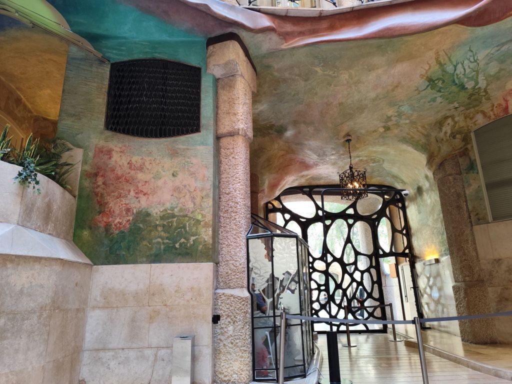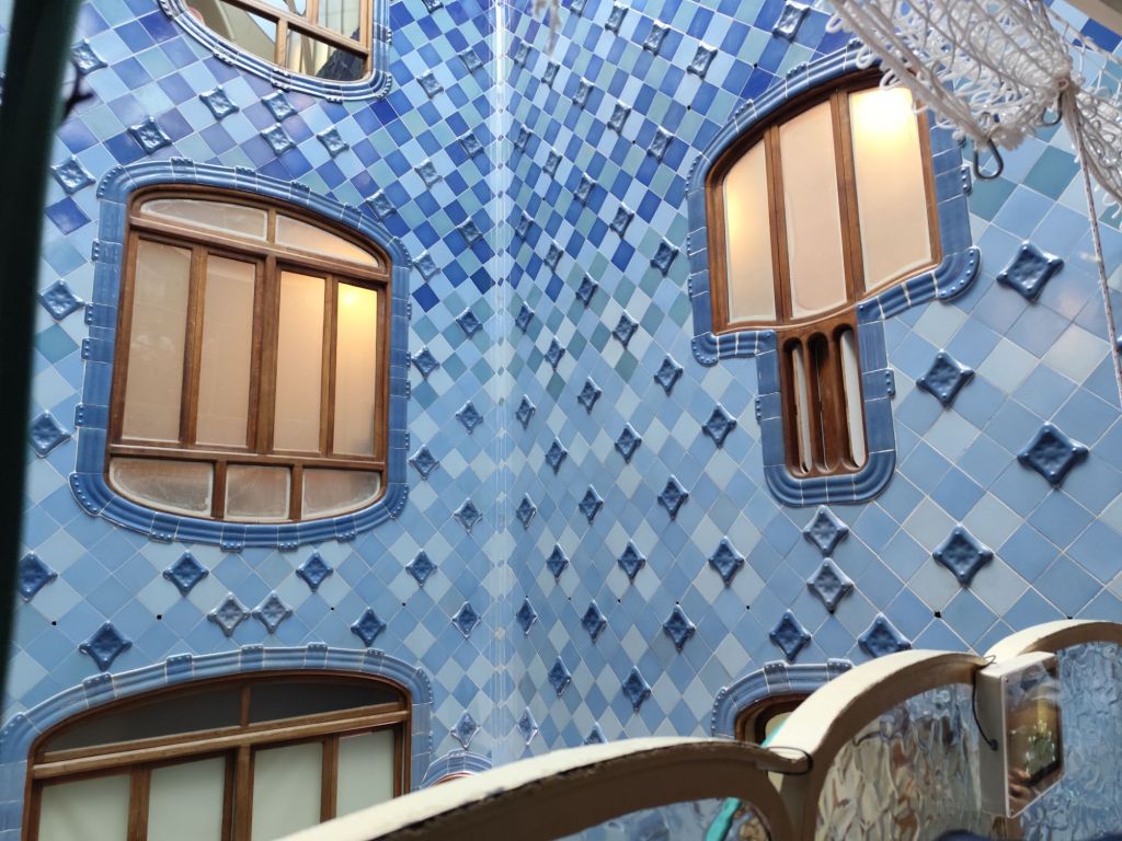 Eppure, penso, il Mediterraneo è stato un compagno costante in queste giornate barcellonesi. L’ho ritrovato a Casa Battló, nelle finestre ovalari che richiamano quelle delle navi e nell’azzurro che rimanda al colore del mare. L’ho ritrovato nella luce della Sagrada Familia, più calda verso ovest dove il sole tramonta, più fredda a est in direzione dell’alba. L’ho intravisto alla Pedrera, nelle sue scalinate rivestite di azzurro e verde e nelle onde della sua facciata e nel Parc Güell, che mi rimanda ai giardini dell’Alcázar, visti a Siviglia alcuni anni fa. Dalla piazza della Natura, sopra la sala ipostila, al Parc Güell, si vede il mare e il mosaico che ne ricopre il parapetto ondulato sembra in continuità con l’acqua lontana, riflettendone le oscillazioni e il rifrangersi della luce sulla sua superficie.
